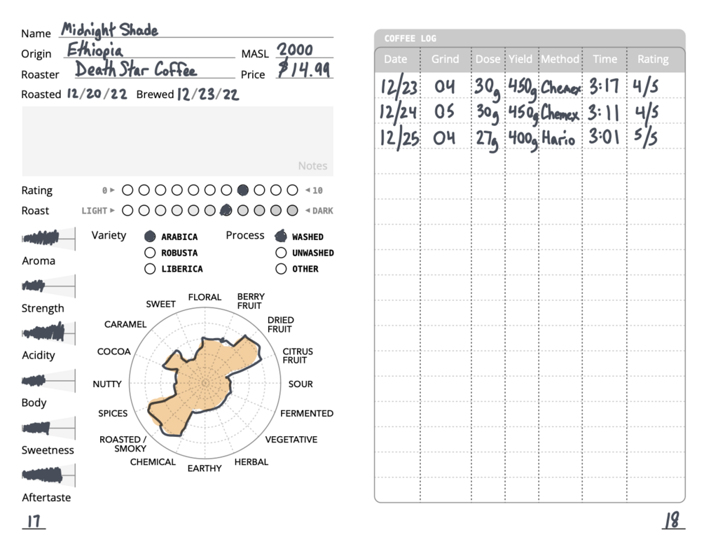 - A table for logging up to 17 entries, including Date, Grind Size, In (weight), Out (weight), Ratio, Extraction Time, and your Rating.